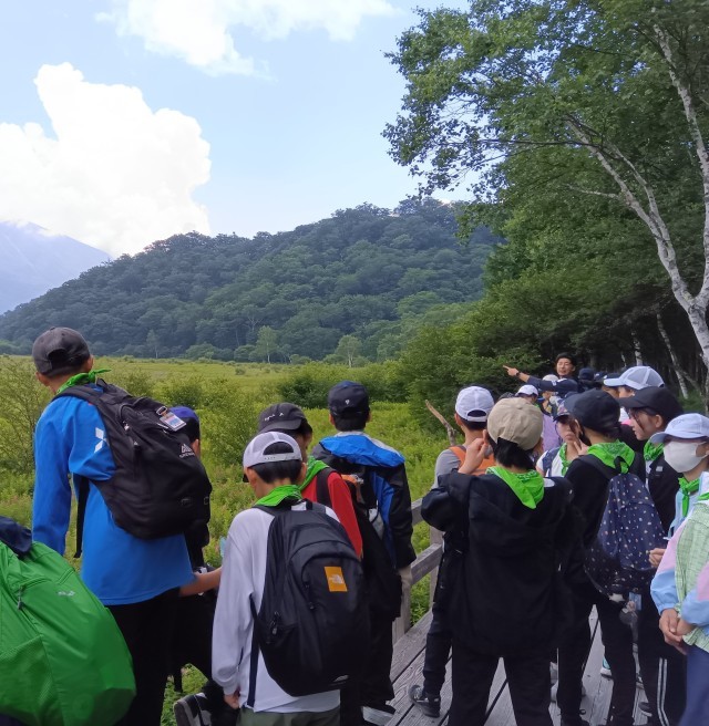湯滝を出発した後、途中で小田代原コースと戦場ヶ原コースに分かれました。小田代原コースは距离が長く、木の根が出ているところや高い段差があるところがあり大変でしたが、みんなで楽しく話したり、励まし合ったりしながら、ゴールすることができました。木が生い茂った場所からひらけた場所に出たときの景色のよさに子どもたちは感嘆の声をもらしていました。小田代の貴婦人にも会うことができました。