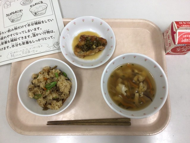 今日の給食は、きんぴらおこわ、鯖の唐揚げ香味ソース、かしわ汁、牛乳です。