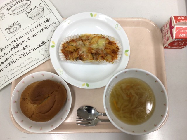 今日の給食は、黒砂糖パン、ペンネミートグラタン、ジュリアンスープ、牛乳です。