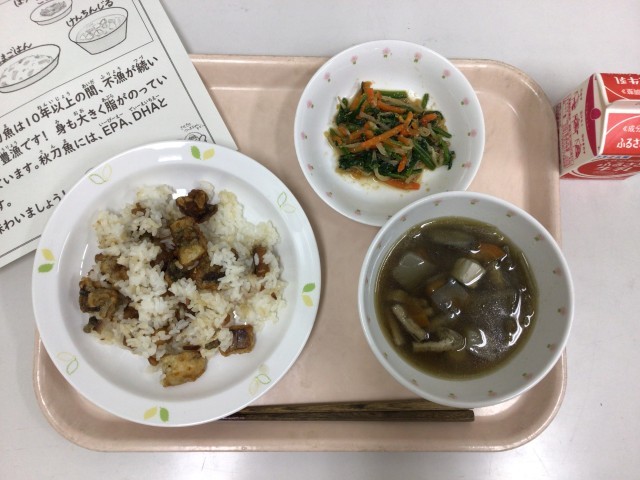 今日の給食は、秋刀魚ごはん、けんちん汁、ほうれん草のごまあえ、牛乳です。