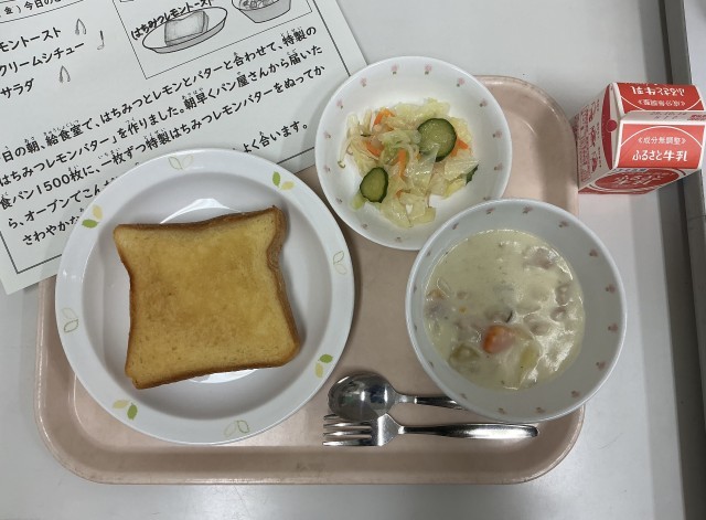 今日の給食は、はちみつレモントースト、秋野菜のクリームシチュー、フレンチサラダ、牛乳です。