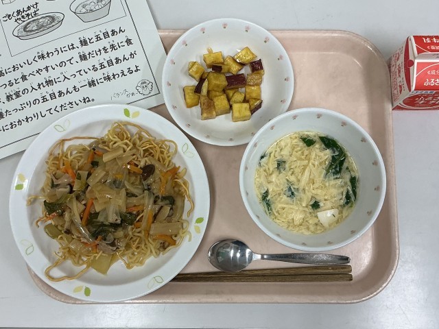 今日の給食は、五目あんかけ焼きそば、豆腐と玉子のスープ、大学いも、牛乳です。