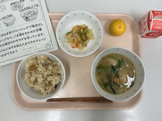 今日の給食は、いなりごはん、豆腐団子汁、みそドレサラダ、くだもの(みかん)、牛乳です。
