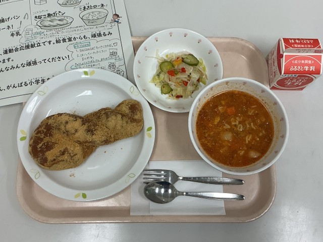 今日の給食は、黒糖パンのきなこ揚げパン、ミネストローネ、カラフルサラダ、牛乳です。