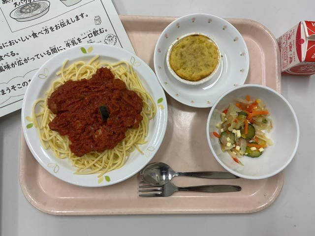 今日の給食は、秋ナスとトマトのスパゲッティ、チーズ入りサラダ、スイートポテト、牛乳です。