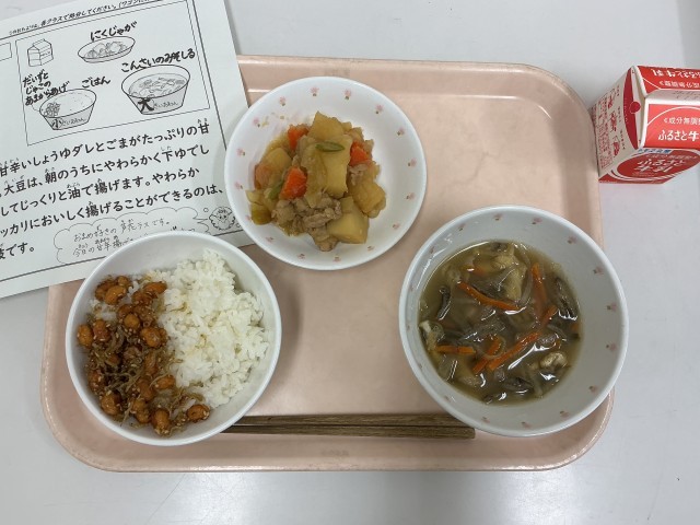 今日の給食は、ごはん、大豆とじゃこの甘辛揚げ、肉じゃが、根菜のみそ汁、牛乳です。