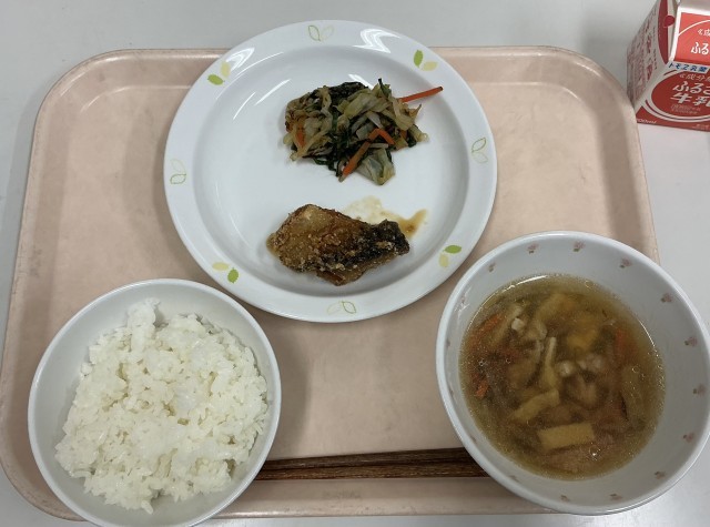 今日の給食は、有機米ごはん、鯖のごま揚げ、野菜の磯あえ、かしわ汁、牛乳です。