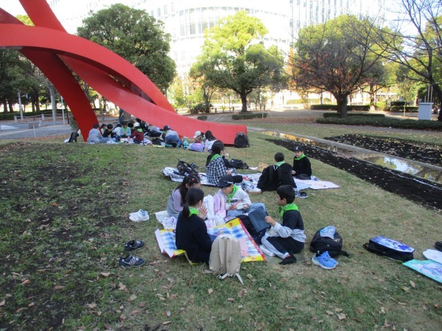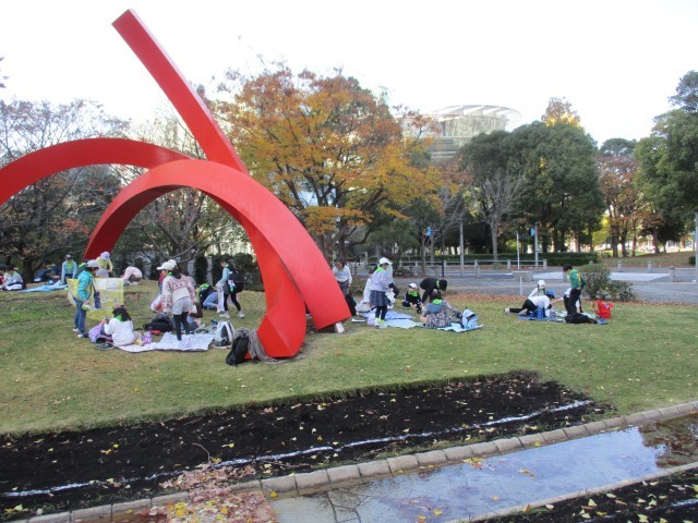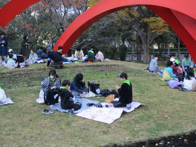 滝の広場でお弁当を食べています。紅葉もきれいな場所でおしゃべりもしながら、美味しいお弁当を食べています。お弁当の準備ありがとうございました。