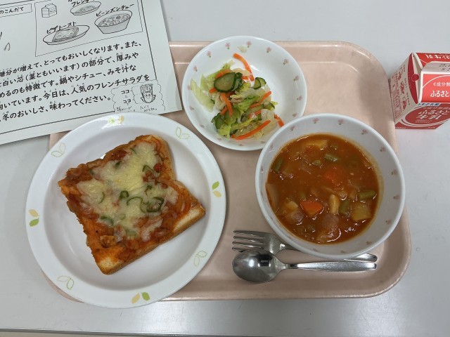 今日の給食は、ピザトースト、ビーンズシチュー、冬のフレンチサラダ、牛乳です。