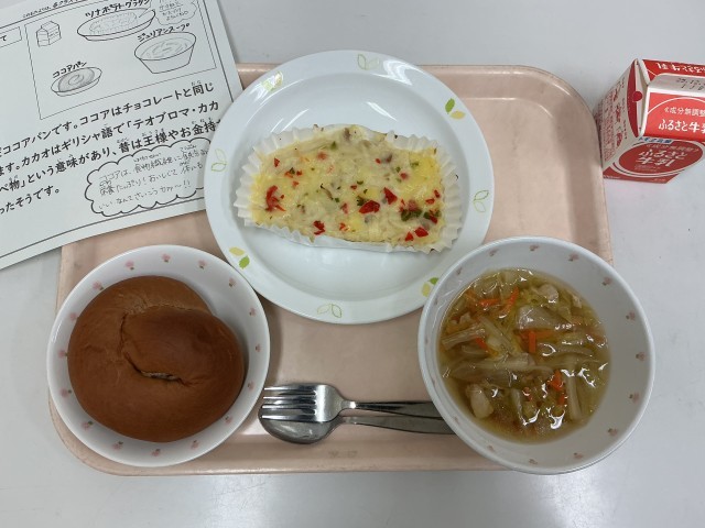 今日の給食は、ココアパン、ツナポテトグラタン、ジュリアンスープ、牛乳です。