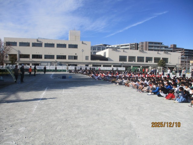 12月の避難訓練を小中合同で行いました。中学校3階の第3理科室から出火し、防火扉が作動している中での避難訓練でした。動物階段の1階の防火扉が閉まっている中で避難をしました。いつもと違う中での避難でしたが、おしゃべりなく静かに避難できました。中学校の風間校長先生から、北海道・三陸沖地震、群馬や神奈川で発生している山火事などの災害を踏まえ、自分や友達の身を守るための行動についてお話がありました。避難の際に防火扉を通らなかった学級は帰りに防火扉を通って教室の戻りました。