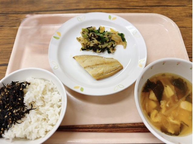 今日の給食は、ごはん、ひじきふりかけ、ホッケの一夜干し、野菜の磯和え、大根と油揚げのみそ汁、牛乳です。