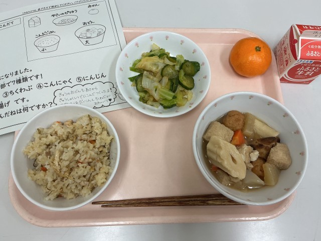 今日の給食は、昆布ごはん、おでん、野菜のピリカラ、みかん、牛乳です。