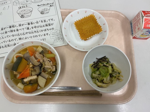 今日の給食は、ほうとう、きゃべつの塩こんぶ和え、にんじんケーキ、牛乳です。