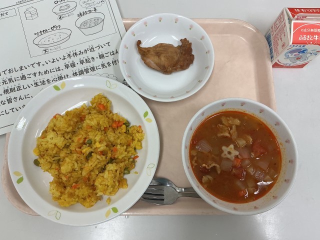 今日の給食は、ツナカレーピラフ、ローストチキン、ミネストローネ、牛乳です。