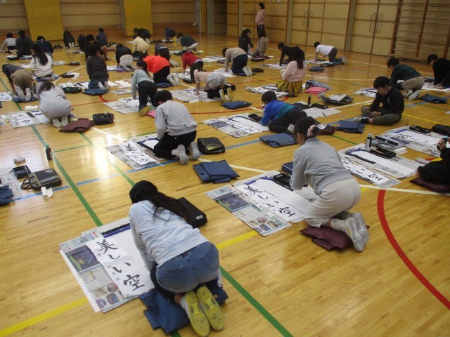 4年生は「美しい空」です。2回目の毛筆での席書会。みんな集中して取り組んでいます。