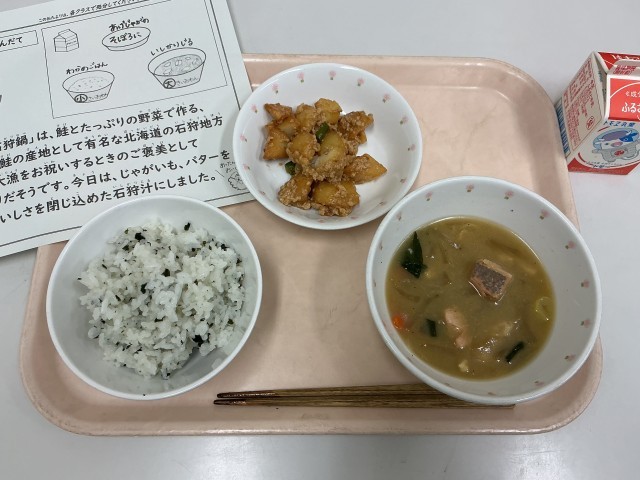 今日の給食は、わかめごはん、石狩汁、揚げじゃがのそぼろ煮、牛乳です。
