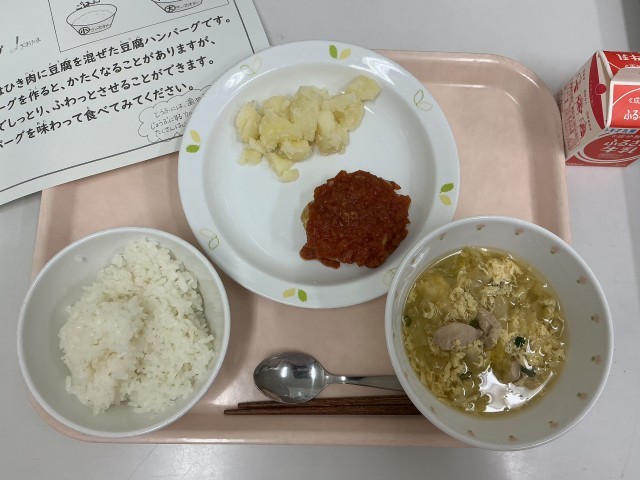 今日の給食は、ごはん、豆腐入りハンバーグ、粉ふきいも、キャベツと玉子のスープ、牛乳です。