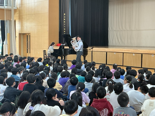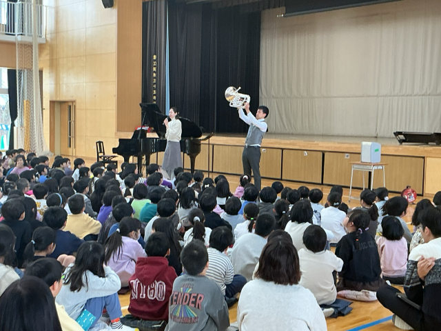 1月15日、学校で子どもたちに音楽を届けている「エバリー」からユーフォニアムとピアノ担当のお二人がいらして、体育館でミニコンサートをしていただきました。