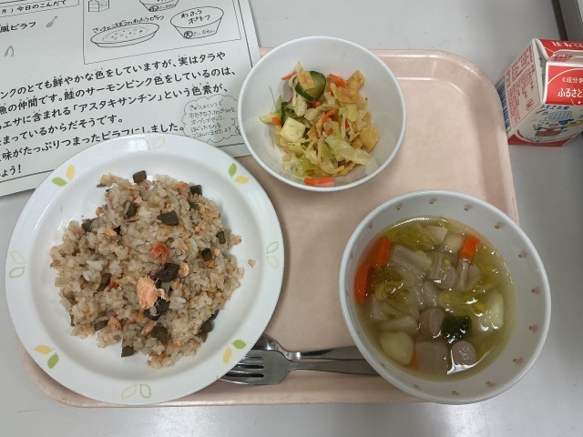 今日の給食は、鮭とごぼうの和風ピラフ、和風ポトフ、みそドレサラダ、牛乳です。