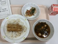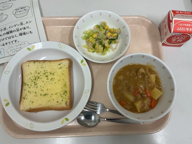 今日の給食は、ガーリックトースト、ひよこ豆とポークのシチュー、ツナとコーンのサラダ、牛乳です。