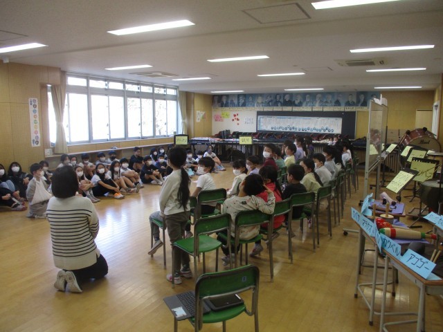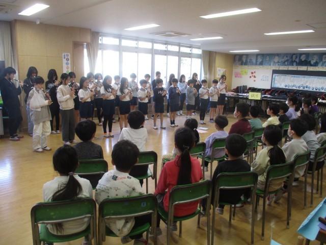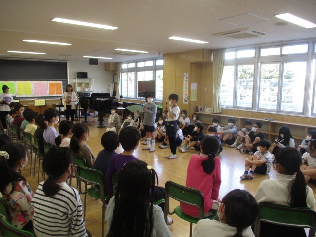 3年生になると音楽で「リコーダー」を習う2年生。今日は音楽室で5年生がリコーダーの演奏と歌を披露してくれました。リコーダーの吹き方について説明したうえで「威風堂々」をきれいに演奏してくれました。また、合唱も2曲披露してくれました。2年生からは、リコーダーの演奏や合奏について、しっかりと感想が述べられていました。2年生は5年生に対する憧れ、5年生は最上級生になる気持ちの高まりがみられる良い交流会となりました。写真は、5年3組と2年5組の交流の様子です。