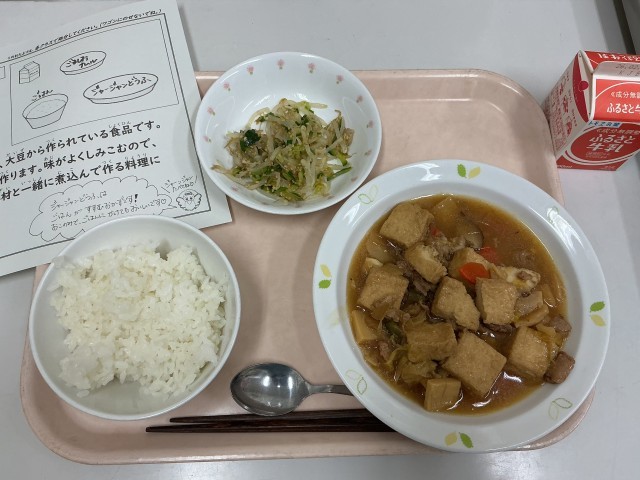今日の給食は、ごはん、家常豆腐、ごま塩ナムル、牛乳です。
