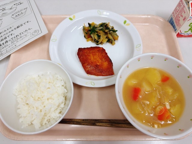 今日の給食は、有機米ごはん、鯖のコチジャン焼き、野菜の磯あえ、有機じゃがいものみそ汁、牛乳です。