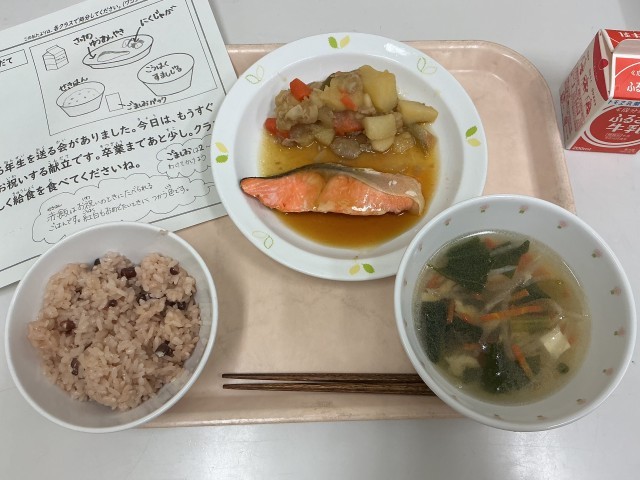 今日の給食は、赤飯、鮭の幽庵焼き、肉じゃが、紅白すまし汁、牛乳です。