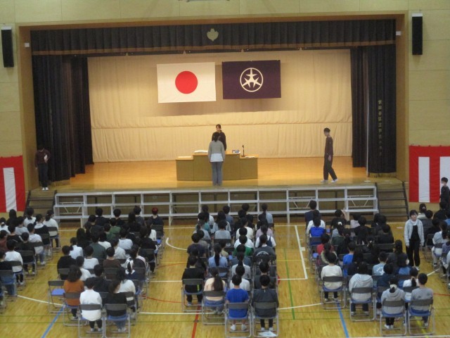 卒業式の準備ができた体育館で6年生が通し練習を行っています。卒業式に向けて気持ちの準備もしっかりとして練習に取り組んでいます。
