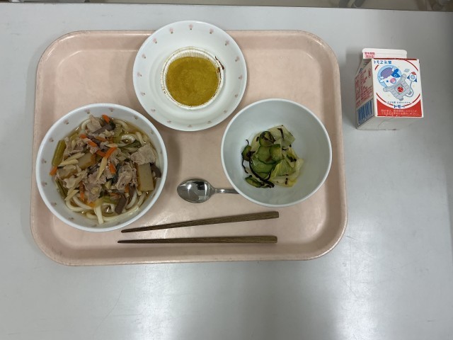 今日の給食は、五目うどん、野菜の浅漬け、スィートポテト、牛乳