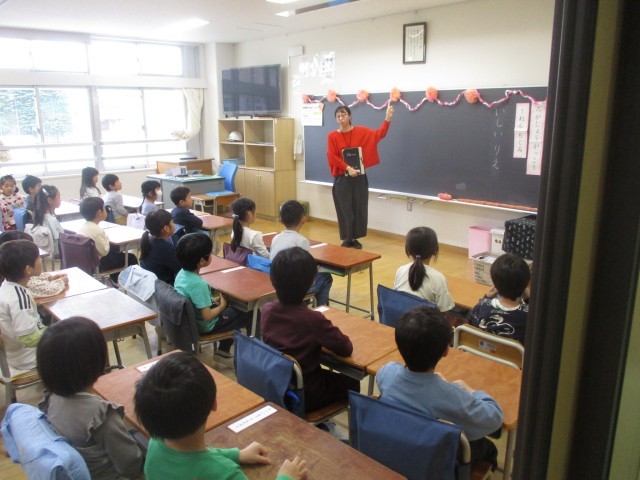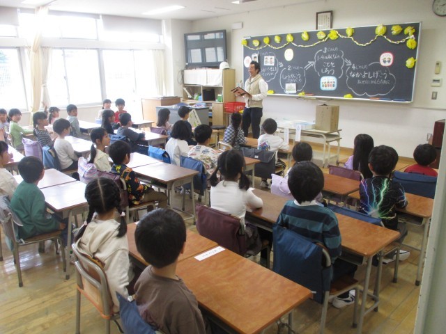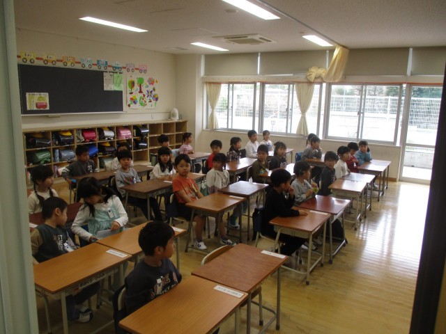 教室で朝の準備を終えた1年生。自分の席にしっかり座って担任の先生の話を静かに聞いています。