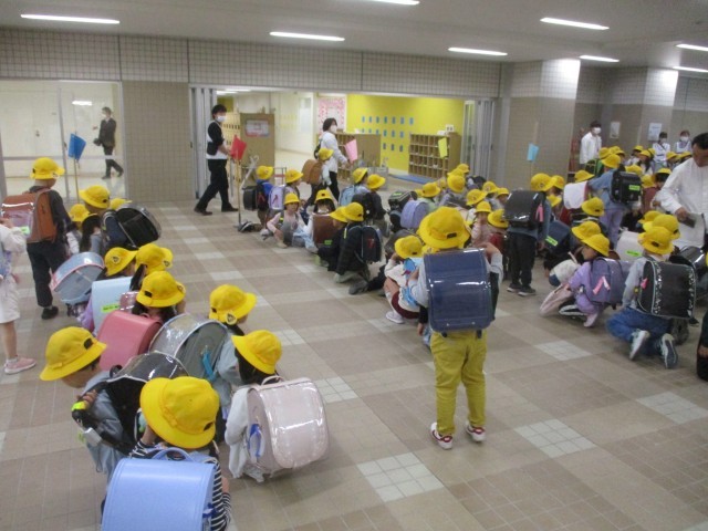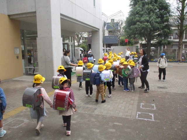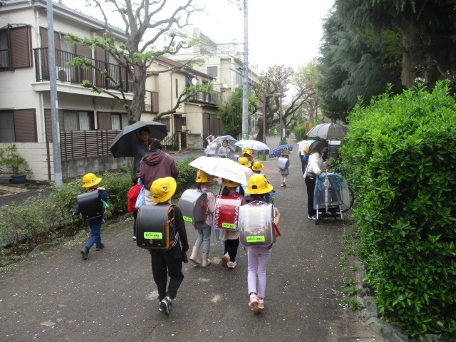 1日目の学習を終えて1年生が下校します。それぞれのコースに分かれての下校です。みんなでしっかりと並んで下校していきます。小学校1日め、よく頑張りました。