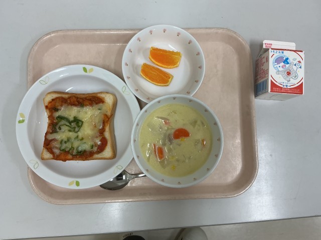 今日の給食は、ピザトースト、クリームスープ、清見オレンジ、牛乳です。