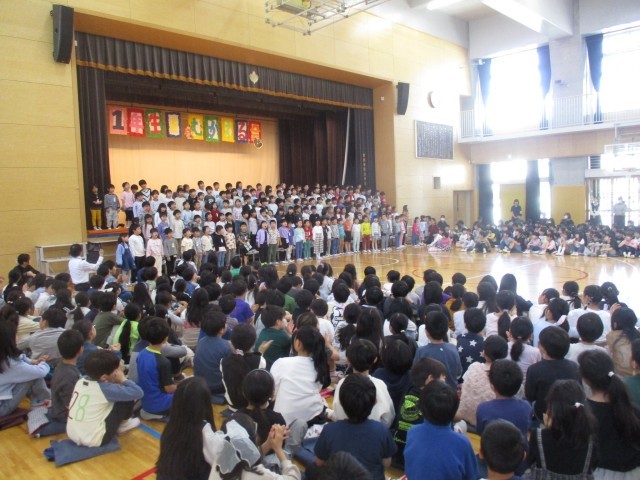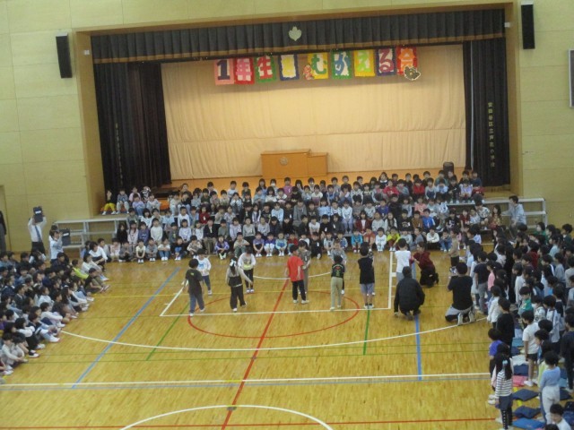 3校時に体育館に全校で集まって「1年生を迎える会」を行いました。4月6日(月)に入学した154名の1年生。全校のお兄さん、お姉さんと会うのは今日が初めてです。6年生と手をつないで入場したときは緊張している子もいましたが、上級生からの温かい歓迎を受け、「1年生になったら」の歌も元気に歌っていました。来週からは校庭遊びも始まります。芦花小学校の一員となった1年生ともっともっと仲良くしていきましょう。
