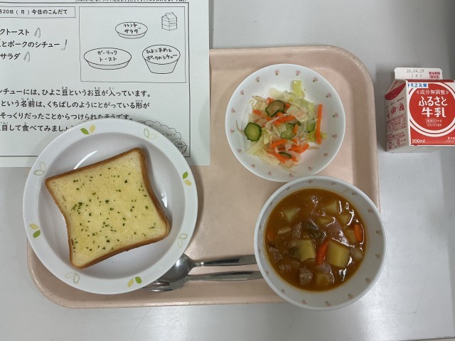 今日の給食は、ガーリックトースト、ひよこ豆とポークのシチュー、フレンチサラダ、牛乳です。