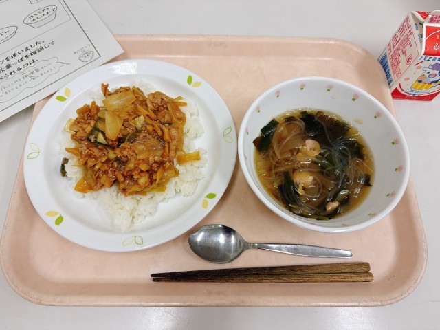 今日の献立は、回鍋肉(ホイコウロウ)丼、春雨と野菜のスープ、牛乳 です。