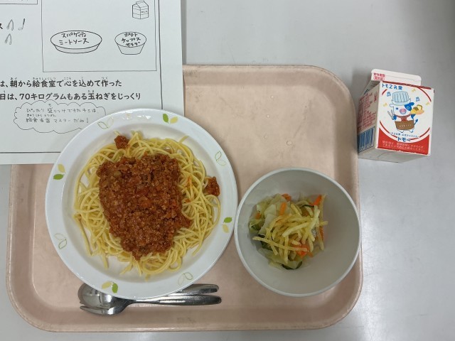 今日の給食は、スパゲッティミートソース、ポテトチップスサラダ、牛乳です。