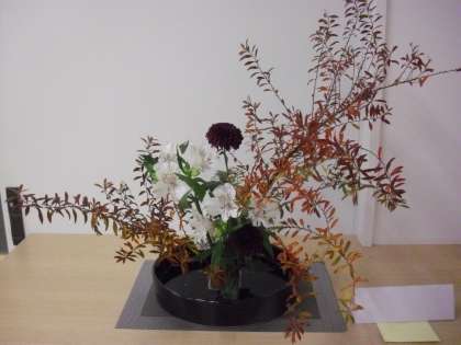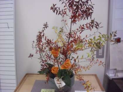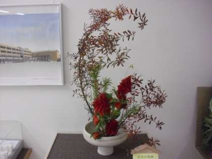 中学校生け花部の作品です。上から小学校事務室前の作品です。花材は、ピンポン菊、アルストロメリア、雪柳です。次の作品は、職員室前の作品です。花材は、雪柳、バラ、アンセリウムです。続いての作品は、中学校東昇降口前の作品です。花材は、シルバードロップ、キャッスルケイトウ、雪柳です。