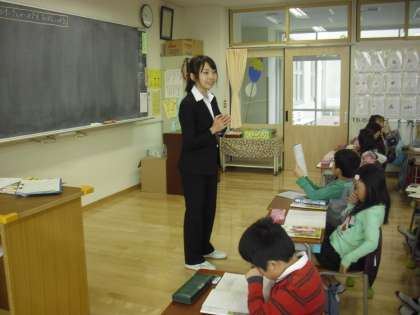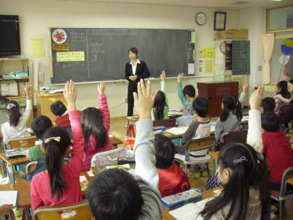 1年生の算数の授業の様子です。約1ヶ月の教育実習のまとめである実習生による研究授業です。繰り下がりのある引き算の学習です。ノートに書いた自分の考え方の絵図や文を隣の友達に伝え合う活動をとり入れました。子どもたちは進んで自分の考えを発表しようと意欲的でした。