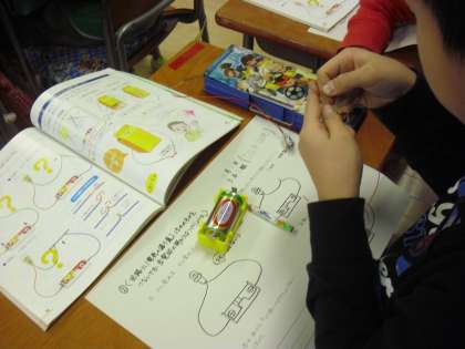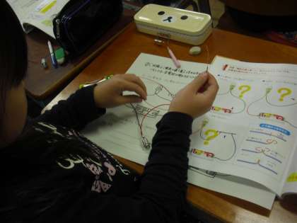 3年生の理科の授業の様子です。電気の通り道の学習で豆電球に付いている2本の導線のビニールを使いやすいように1センチほど、はがしているところです。失敗しないように慎重に作業を進めていました。