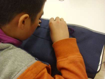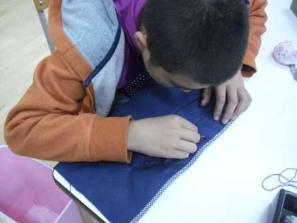ひかり学級の手芸の授業の様子です。スウェーデン刺しゅうに取り組んでいるところです。作品作りも大切ですが、作品作りを通して、手先の訓練と一定時間持続して作業ができる集中力を養います。飛行機の模様を描いていました。
