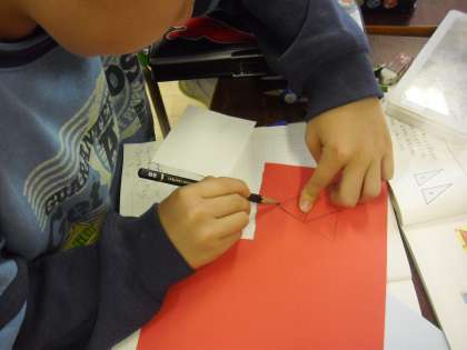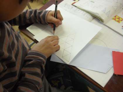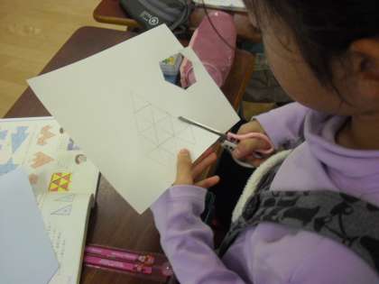 3年生の算数の授業の様子です。三角形を学習している3年生。正三角形を組み合わせて模様を作る活動に取り組んでいます。色画用紙に正三角形を描き、切り取っているところです。図形の特徴を考えて模様を描きます。