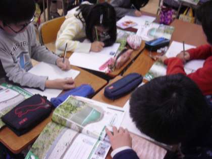 5年生の理科の授業の様子です。地面を流れる水や川の様子から、流れる水の速さや量によるはたらきの違いを調べていきます。今日は、グループで予想を立てているところです。八幡山保育園の砂場を借りて実験を行う予定です。