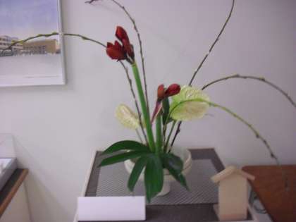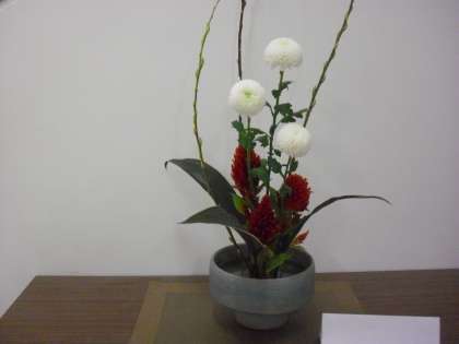 上の写真は中学校東昇降口前の作品です。花材は、赤目柳、アママリス、アンスリウム、モンステラです。下の写真は、西昇降口前の作品です。赤目柳、ピンポンマム、ケイトウ、ドラセナです。師走を迎えていますが、生け花を見ると気持ちが落ち着きます。