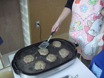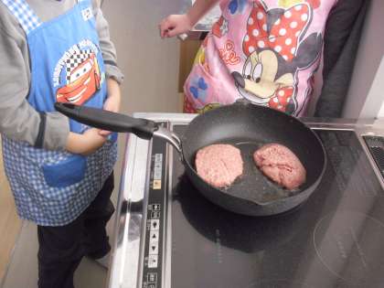 ハンバーグを焼いているところです。自分が作ったハンバーグをホットプレートやフライパンにのせます。こげ目が付いたら裏返します。6年生はリーダー的な役割を果たしてくれています。