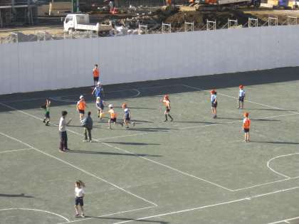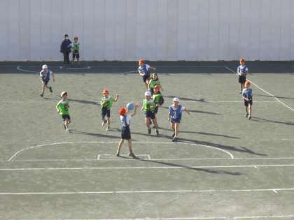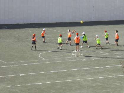 3年生の体育の授業の様子です。ボールゲームをしているところです。バスケットボール型のゲームです。ゴールの代わりに子どもが立っていますが、ポートボールのように相手が防ぐような役割は置かずにシュートが入りやすいように工夫しています。