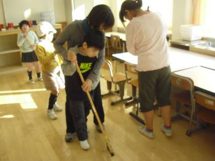 ひかり学級の掃除の様子です。みんなでゴミを掃いて、雑巾で床をふきます。ゴミをよく見て掃く、雑巾をすすいで水をよくしぼることも生活の中で身に付ける大切なことです。みんなの教室をみんなできれいにします。