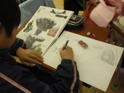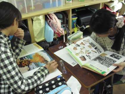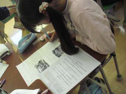 6年生の社会の授業の様子です。歴史の学習に取り組んでいるところです。戦争が起こった時代のできごとについて、自分で課題を選び調べて、新聞形式にまとめています。必要な資料を自分たちで見つけて活用しています。