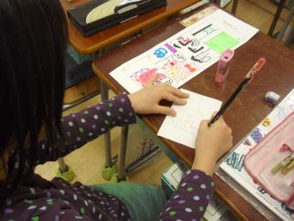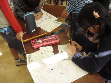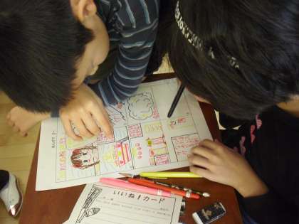 今日は土曜授業でもありました。3年生の図画工作の授業の様子です。一人一人が制作した4コマまんがを読み合い、工夫したところ、楽しいところ、よかったところなどを「いいね!カード」に書いて、友達にわたします。文章での表現、伝え合いです。